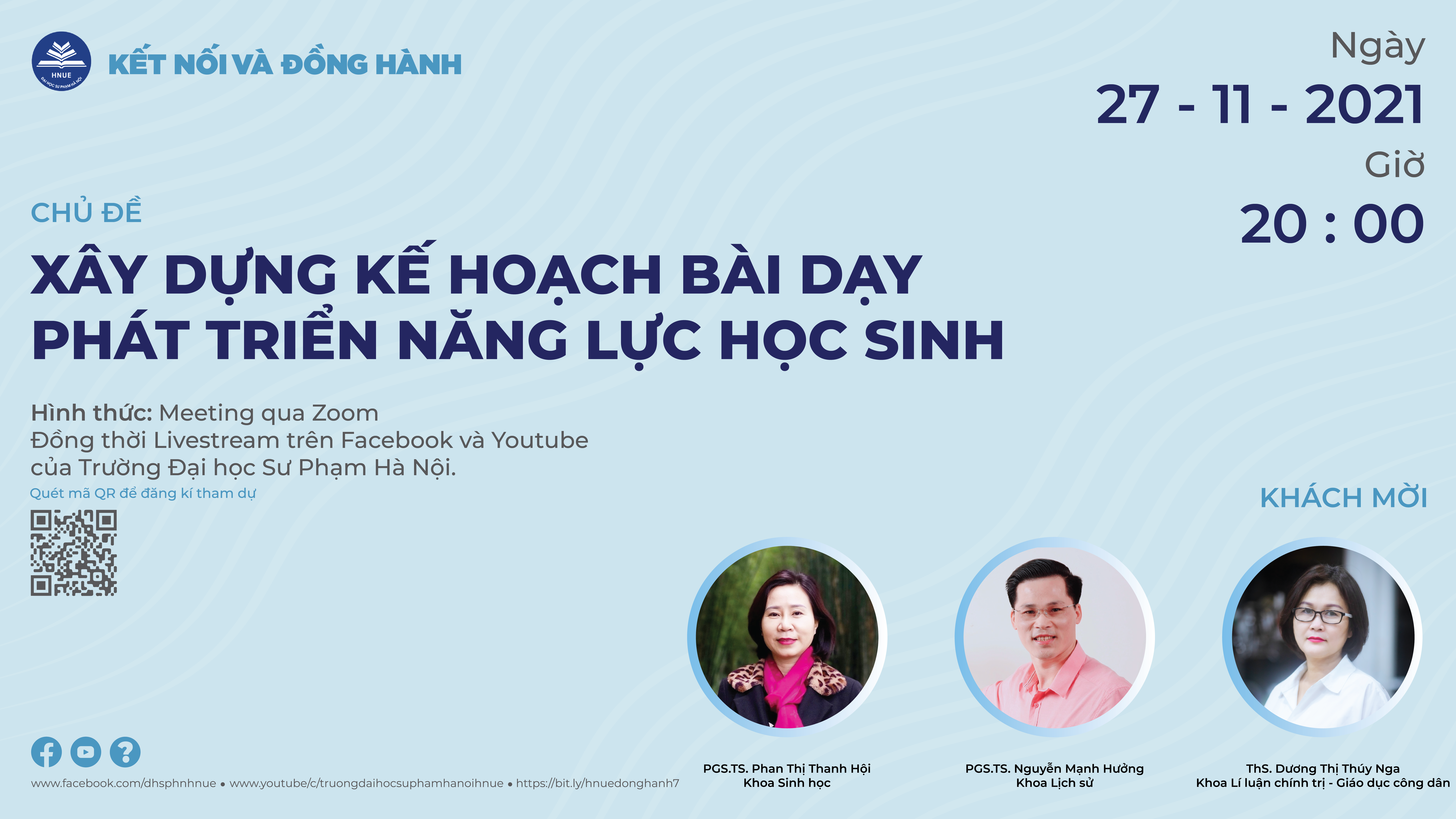 20h thứ 7 ngày 27/11/2021 Trường ĐHSP Hà Nội sẽ tổ chức buổi tư vấn trực tuyến dành cho giáo viên với chủ đề “Xây dựng kế hoạch bài dạy phát triển năng lực học sinh”.